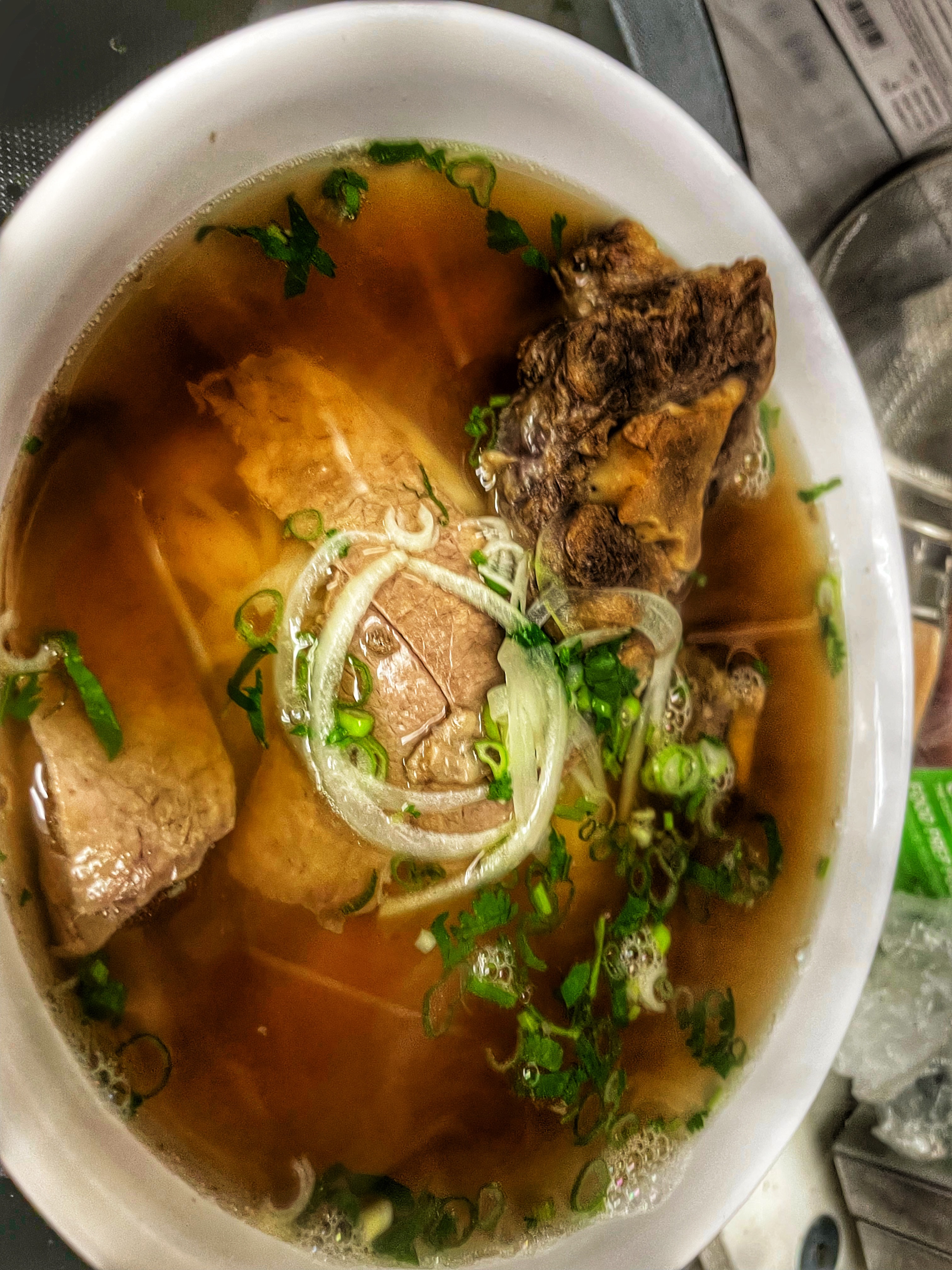 Slow cooked Ox-tall size may vary w/Rice noodles.